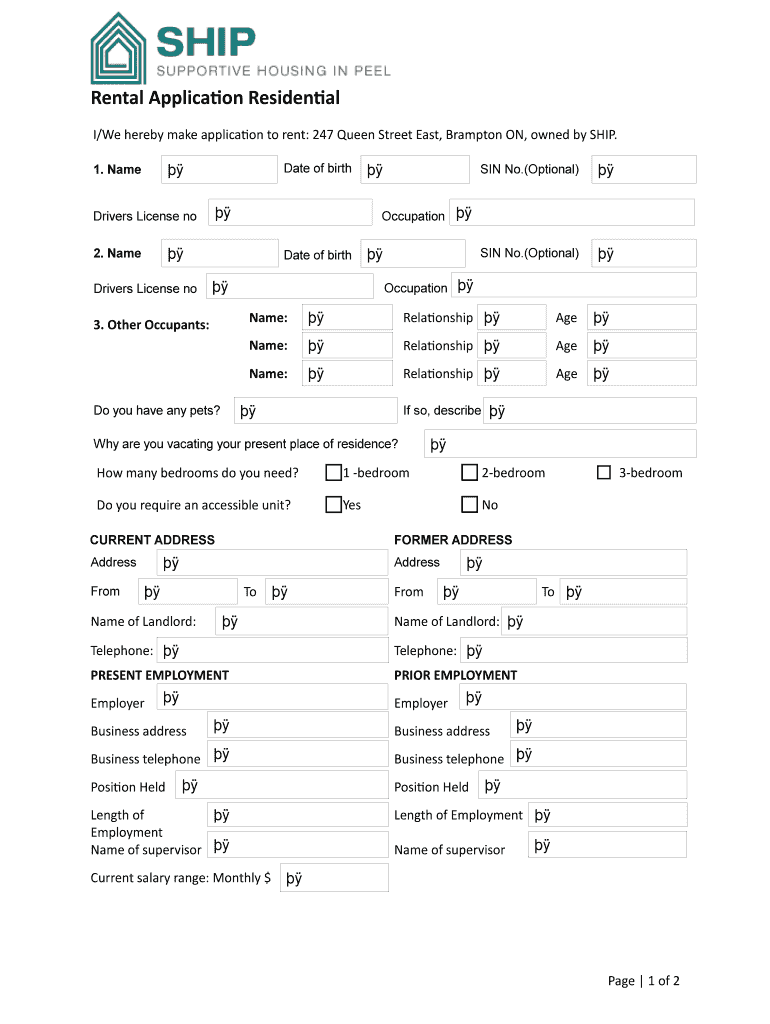 Rental Application Residential I/We hereby make application to rent: 247 Queen Street East, Brampton ON, owned by SHIP. Date of birth 1. Name Driver's License no SIN No.(Optional) Occupation 2. Name
