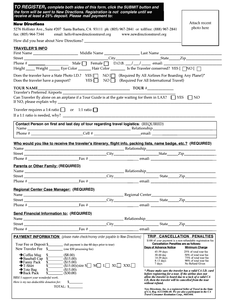 , TO REGISTER complete both sides of this form, click the SUBMIT button and the form will be sent to New Directions. Registration is not complete until we receive at least a 25% deposit. Please mail
