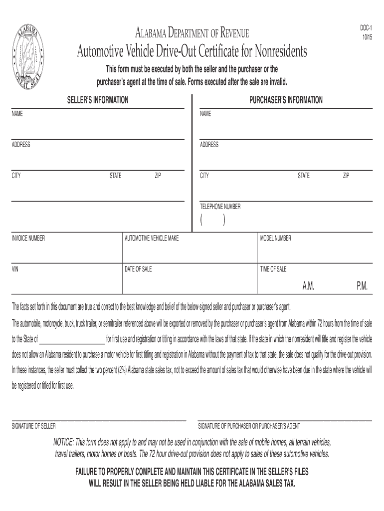 DOC1 10/15 Alabama Department of revenue Automotive vehicle Drive out Certificate for nonresidents Reset Form This form must be executed by both the seller and the purchaser or the purchasers' agent