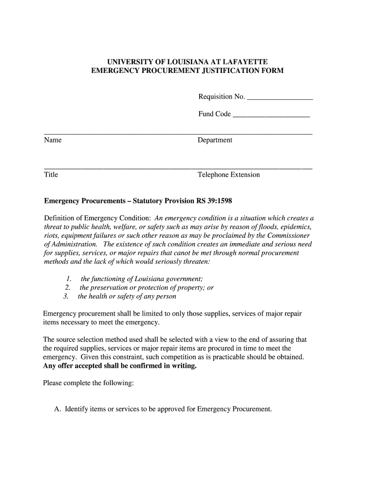 UNIVERSITY OF LOUISIANA AT LAFAYETTE EMERGENCY PROCUREMENT JUSTIFICATION FORM Requisition No. Fund Code Name Department Title Telephone Extension Emergency Procurement Statutory Provision RS 39:1598