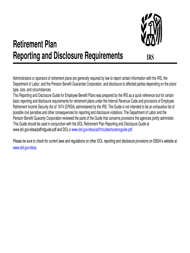 Retirement Plan Reporting and Disclosure Requirements IRS Administrators or sponsors of retirement plans are generally required by law to report certain information with the IRS, the Department of