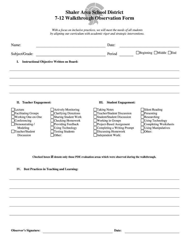 Shale Area School District 712 Walkthrough Observation Form With a focus on inclusive practices, we will meet the needs of all students by aligning our curriculum with academic rigor and strategic