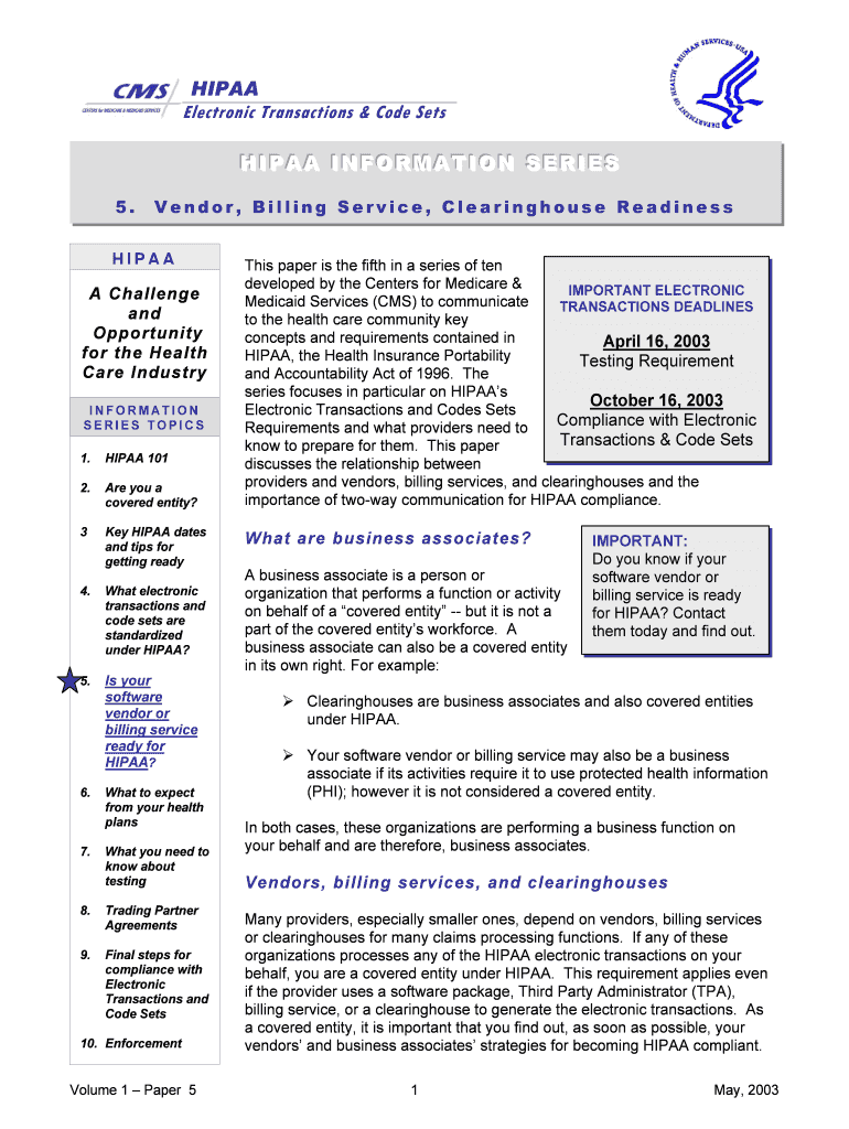 HIPAA Electronic Transactions & Code Sets HIPAA INFORMATION SERIES HIPAA INFORMATION SERIES 5. Vendor, Billing Service, Clearinghouse Readiness HIPAA A Challenge and Opportunity for the Health Care