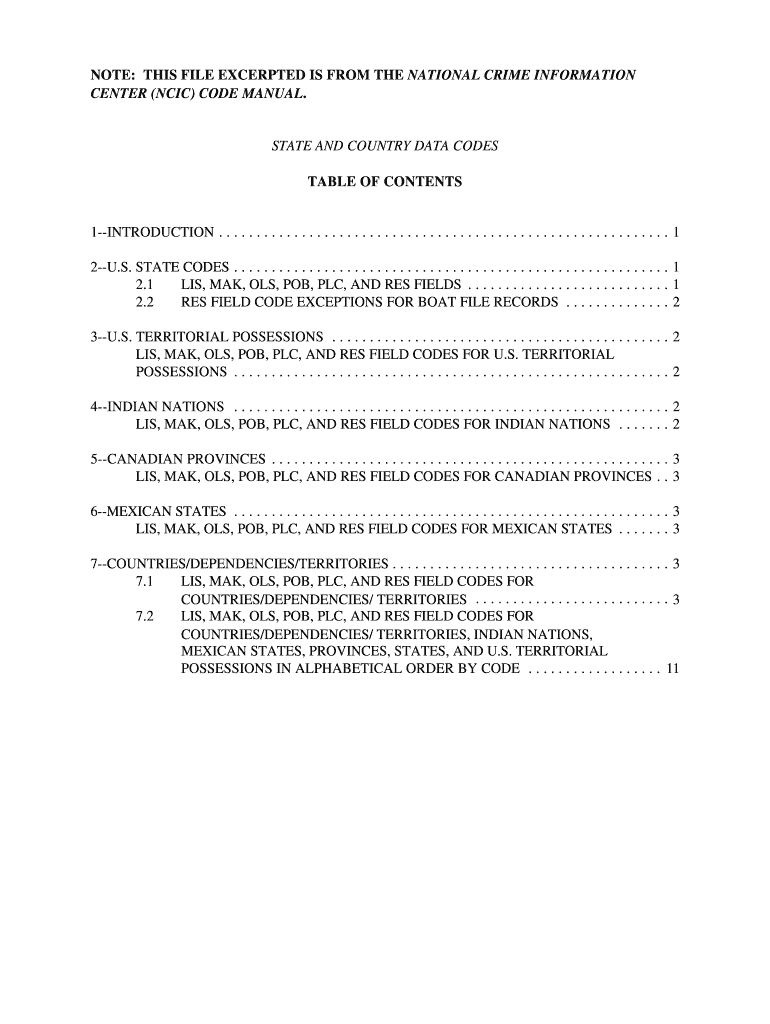 NOTE: THIS FILE EXCERPTED IS FROM THE NATIONAL CRIME INFORMATION CENTER (CIC) CODE MANUAL. STATE AND COUNTRY DATA CODES TABLE OF CONTENTS 1INTRODUCTION. . . . . . . . . . . . . . . . . . . . . . .