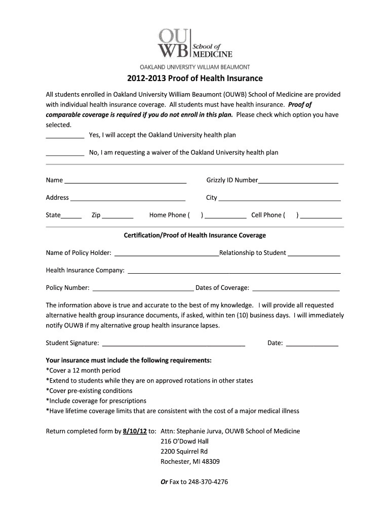 20122013 Proof of Health Insurance All students enrolled in Oakland University William Beaumont (OWB) School of Medicine are provided with individual health insurance coverage. All students must have