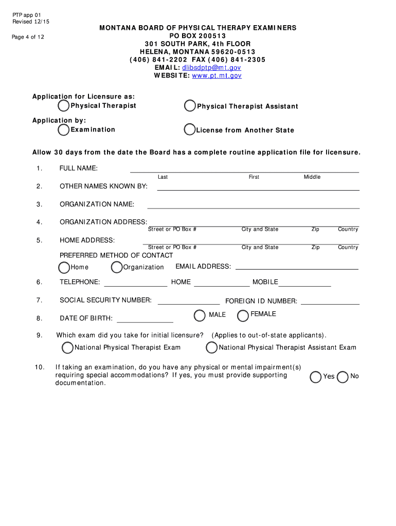 PTP app 01 Revised 12/15MONTANA BOARD OF PHYSICAL THERAPY EXAMINERS PO BOX 200513 301 SOUTH PARK, 4th FLOOR HELENA, MONTANA 596200513 (406) 8412202 FAX (406) 8412305 EMAIL: dlibsdptp CT.gov WEBSITE:
