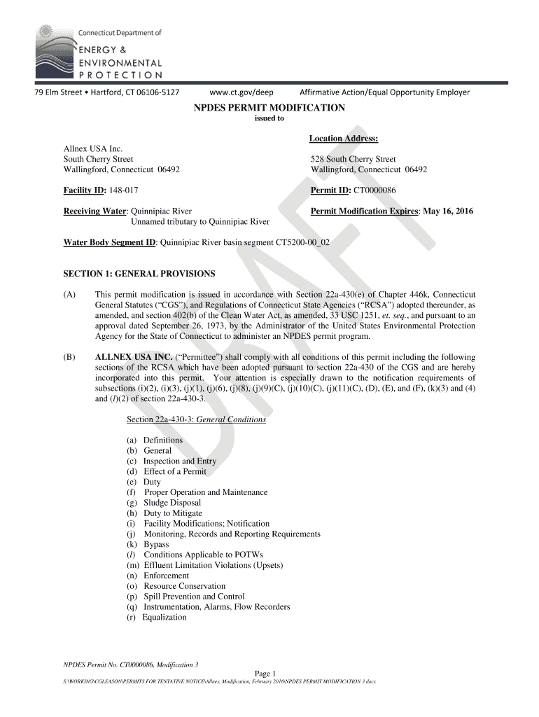 79 Elm Street Hartford, CT 061065127 www.ct.gov/deep Affirmative Action/Equal Opportunity Employer NODES PERMIT MODIFICATION issued to Location Address: Alone USA Inc. South Cherry Street Wallingford,
