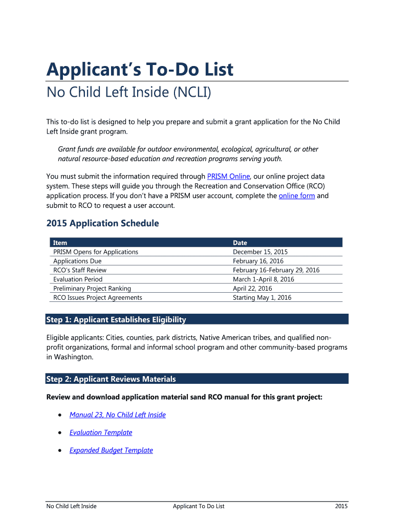 Get the free No Child Left Inside Application To Do List - rco wa