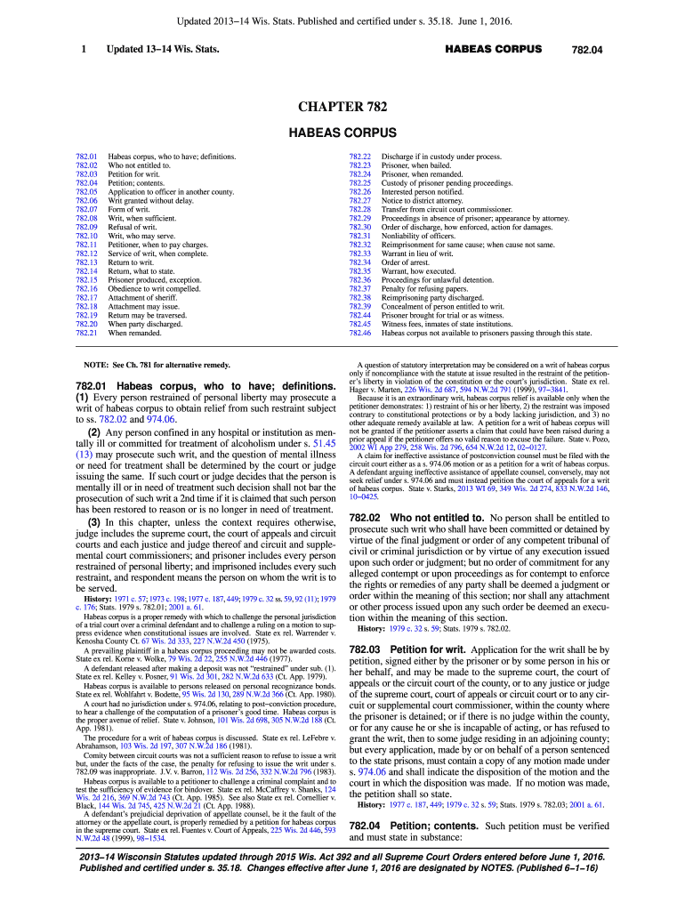 Updated 201314 Wis. Stats. Published and certified under s. 35.18. June 1, 2016. 1 HABEAS CORPUS Updated 1314 Wis. Stats. 782.04 CHAPTER 782 HABEAS CORPUS 782.01 782.02 782.03 782.04 782.05 782.06