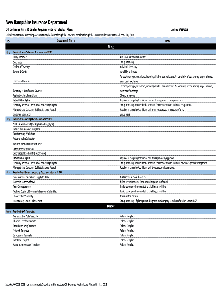 New Hampshire Insurance Department Off Exchange Filing & Binder Requirements for Medical Plans Updated 4/16/2015 Federal templates and supporting documents may be found through the Calzone portal