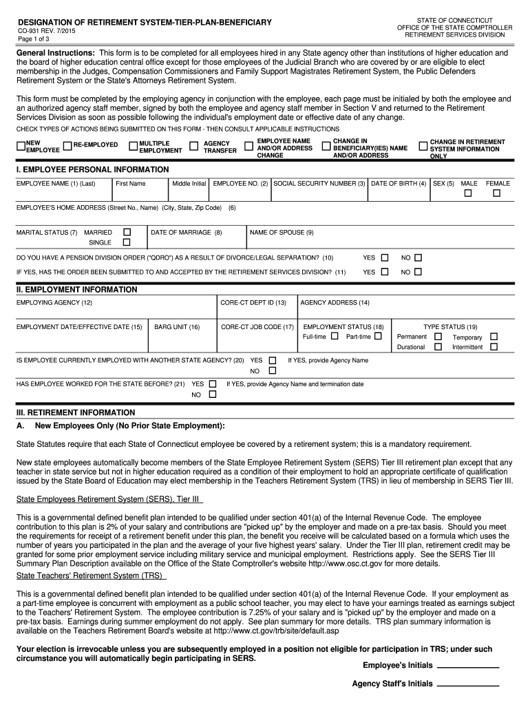General Instructions: This form is to be completed for all employees hired in any State ... State Statutes require that each State of Connecticut employee be covered by a .... check the following