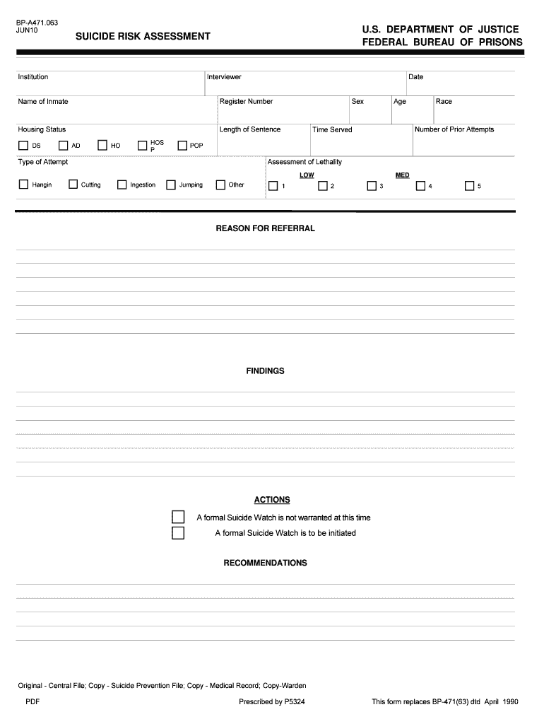 BP-A471.063. JUN10. U.S. DEPARTMENT OF JUSTICE. SUICIDE RISK ASSESSMENT. FEDERAL BUREAU OF PRISONS. Institution. Date. Name of Inmate.