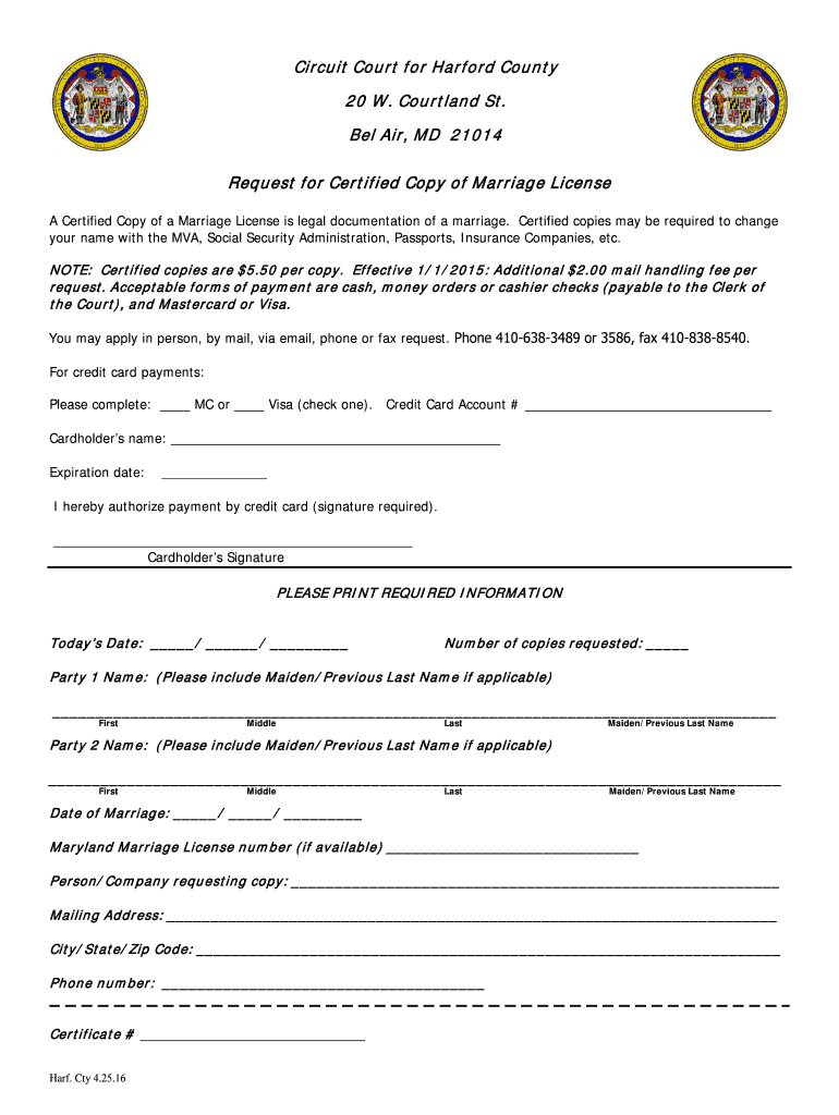 Get the free Request for Certified Copy of Marriage License - Harford County ... - mdcourts