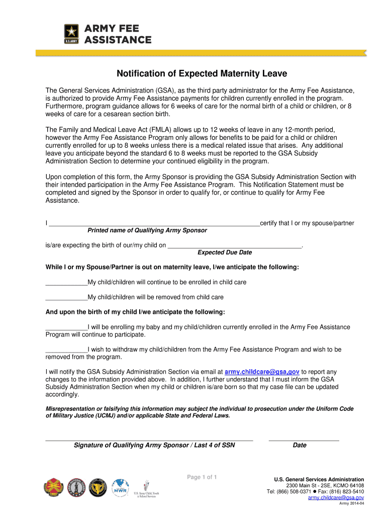 Notification of Expected Maternity Leave ... Upon completion of this form, the Army Sponsor is providing the GSA Subsidy ... This Notification Statement must be.