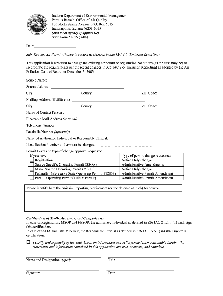 Indiana Department of Environmental Management Permits Branch, Office of Air Quality 100 North Senate Avenue, P.O. Box 6015 Indianapolis, Indiana 462066015 (and local agency if applicable) State Form