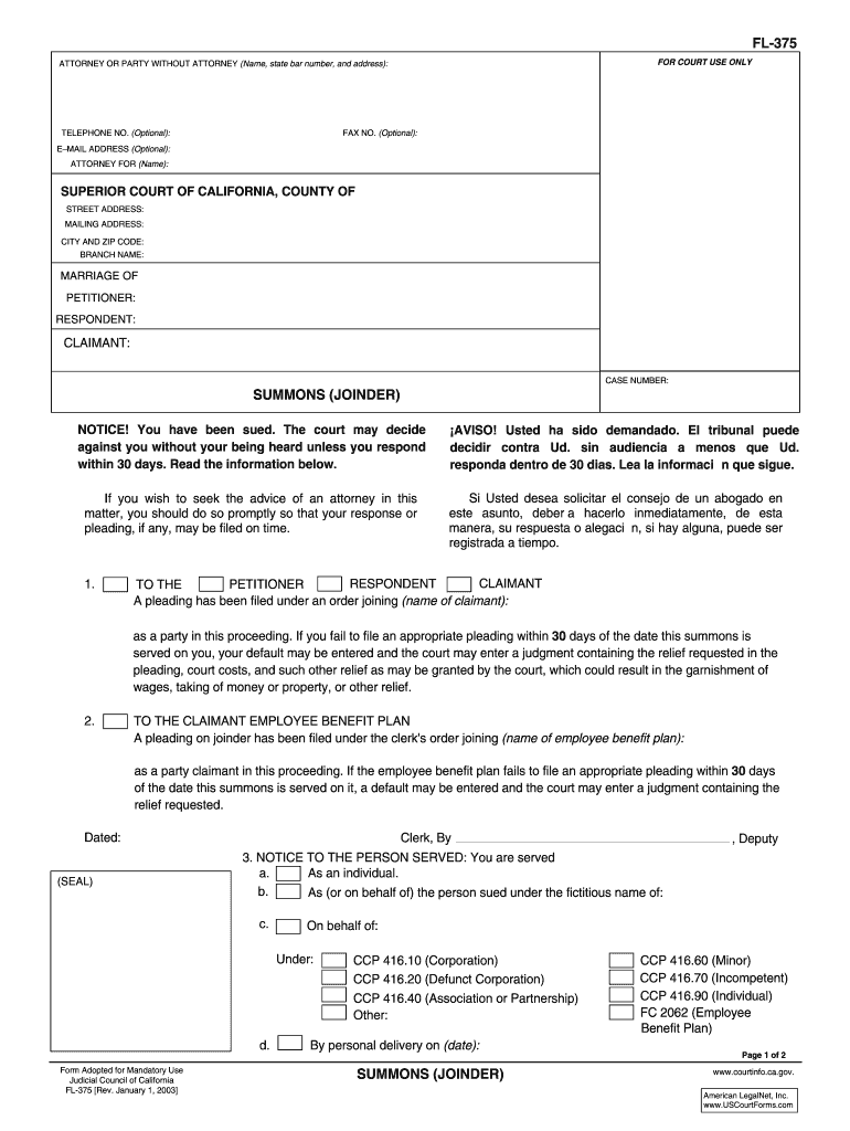Judicial Council of California. FL-375 Rev. January 1, 2003, a. b. 1. FL-375. Page 1 of 2. CITY AND ZIP CODE: BRANCH NAME: STREET ADDRESS: MAILING ...