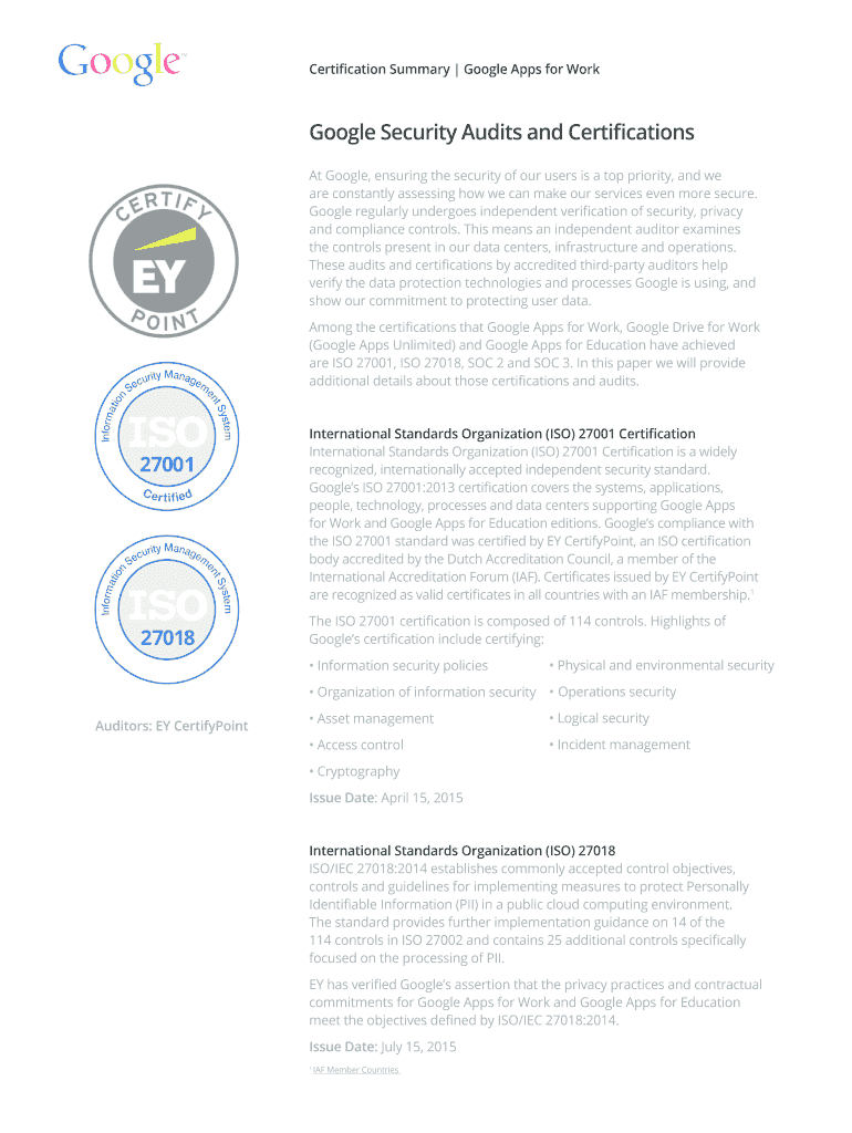 Certification Summary Google Apps for Work Google Security Audits and Certifications At Google, ensuring the security of our users is a top priority, and we are constantly assessing how we can make