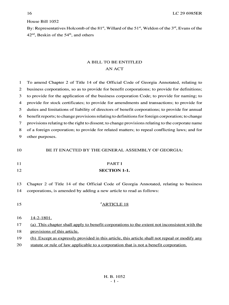 16 LC 29 6985ER House Bill 1052 By: Representatives Holcomb of the 81st, Willard of the 51st, Weldon of the 3rd, Evans of the 42nd, Buskin of the 54th, and others A BILL TO BE ENTITLED AN ACT 1 To