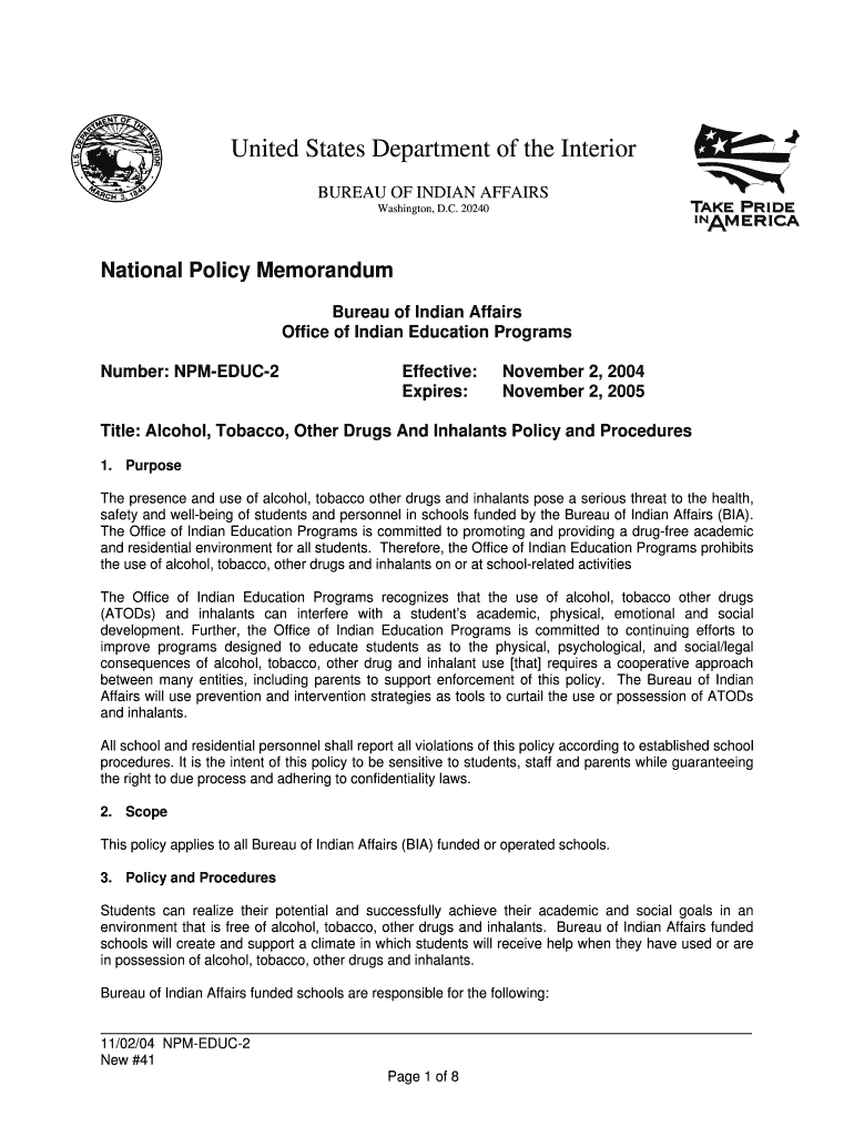 This memorandum outlines the policy and procedures for dealing with alcohol, tobacco, other drugs, and inhalants in Bureau of Indian Affairs funded schools, emphasizing the commitment to a drug-free