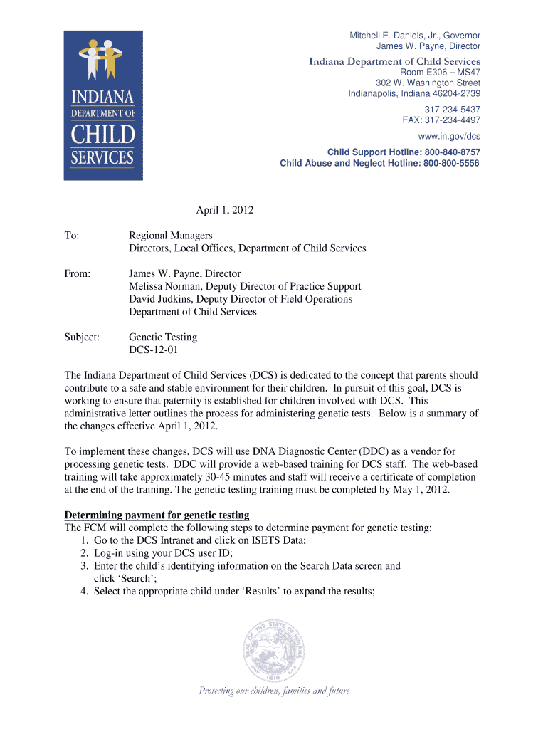 Mitchell E. Daniels, Jr., Governor James W. Payne, Director Indiana Department of Child Services Room E306 MS47 302 W. Washington Street Indianapolis, Indiana 462042739 3172345437 FAX: 3172344497