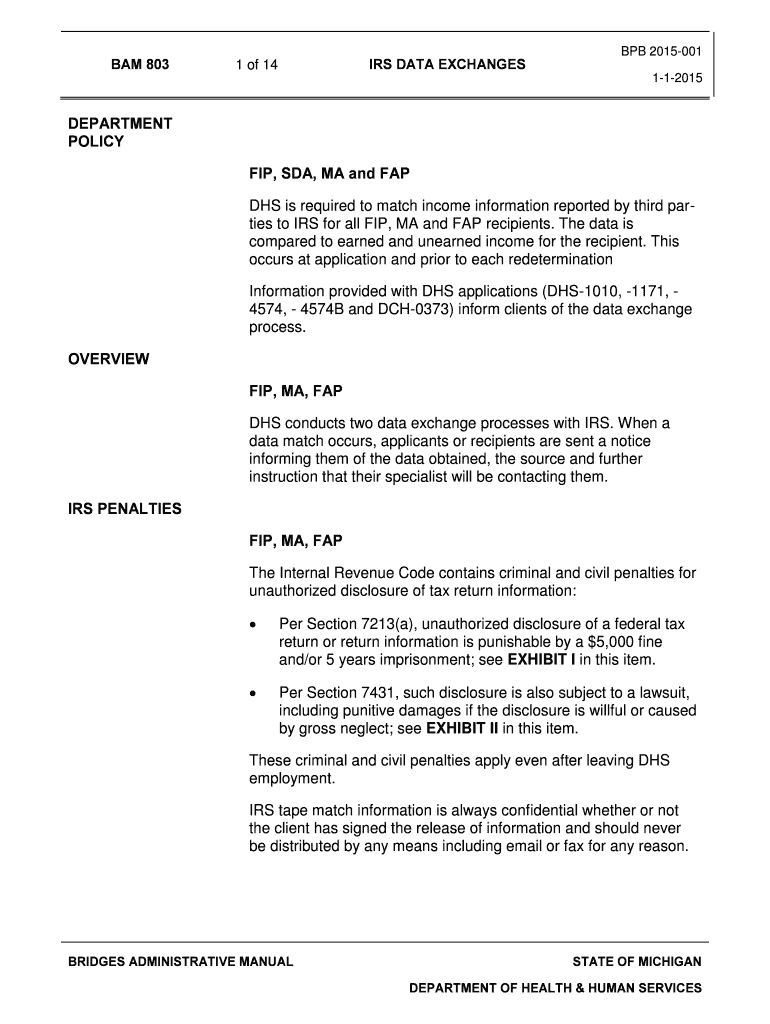 BAM 803 IRS DATA EXCHANGES 1 of 14 BPB 2015001 112015 DEPARTMENT POLICY FIP, SDA, MA and FAP DHS is required to match income information reported by third parties to IRS for all FIP, MA and FAP recipients.
