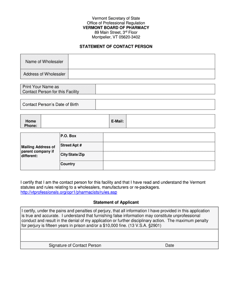 Vermont Secretary of State Office of Professional Regulation VERMONT BOARD OF PHARMACY 89 Main Street, 3rd Floor Montpelier, VT 056203402 STATEMENT OF CONTACT PERSON Name of Wholesaler Address of