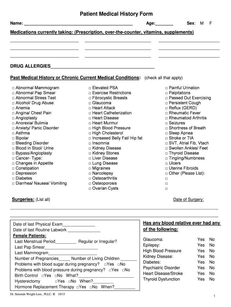 Patient Medical History Form Name: Age: Sex: M F Medications currently taking: (Prescription, overthecounter, vitamins, supplements) DRUG ALLERGIES Past Medical History or Chronic Current Medical
