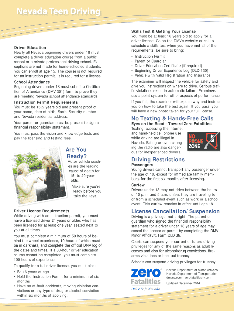 Nevada Teen Driving Driver Education Nearly all Nevada beginning drivers under 18 must complete a driver education course from a public school or a private professional driving school. Exceptions