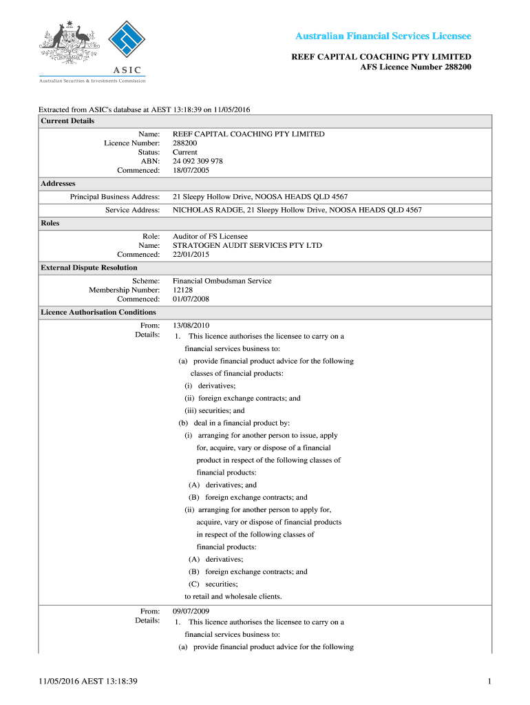 Australian Financial Services Licensee REEF CAPITAL COACHING PTY LIMITED AFS License Number 288200 Extracted from ASIC's database at AEST 13:18:39 on 11/05/2016 Current Details Name: License Number: