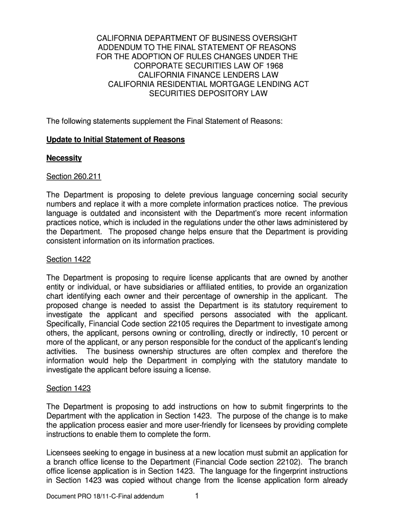 CALIFORNIA DEPARTMENT OF BUSINESS OVERSIGHT ADDENDUM TO THE FINAL STATEMENT OF REASONS FOR THE ADOPTION OF RULES CHANGES UNDER THE CORPORATE SECURITIES LAW OF 1968 CALIFORNIA FINANCE LENDERS LAW CALIFORNIA