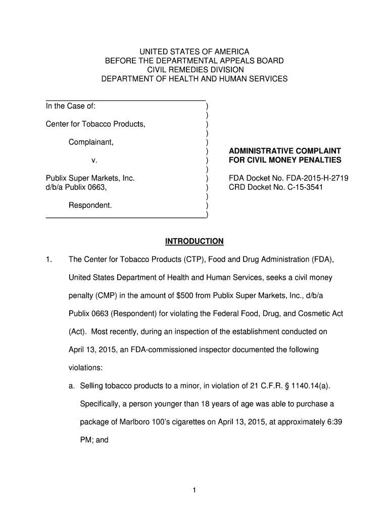 UNITED STATES OF AMERICA BEFORE THE DEPARTMENTAL APPEALS BOARD CIVIL REMEDIES DIVISION DEPARTMENT OF HEALTH AND HUMAN SERVICES In the Case of:))))))))))))) Center for Tobacco Products, Complainant,
