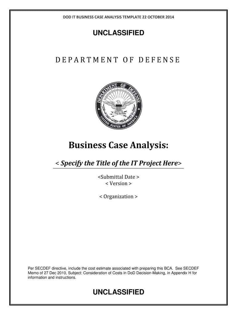 DOD IT BUSINESS CASE ANALYSIS TEMPLATE 22 OCTOBER 2014 UNCLASSIFIED DEPARTMENT OF DEFENSE Business Case Analysis: Specify the Title of the IT Project Here Submittal Date Version Organization Per SECRET