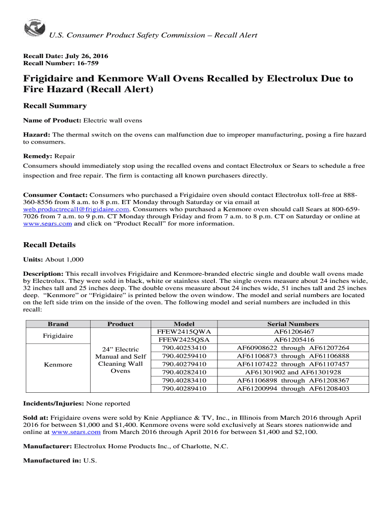 U.S. Consumer Product Safety Commission Recall Alert Recall Date: July 26, 2016, Recall Number: 16759 Frigidaire and Kenmore Wall Ovens Recalled by Electrolux Due to Fire Hazard (Recall Alert) Recall
