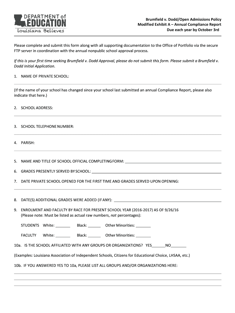 LA Brumfield v Dodd/Open Admissions Policy Modified Exhibit A - Annual Compliance Report 2016 free printable template