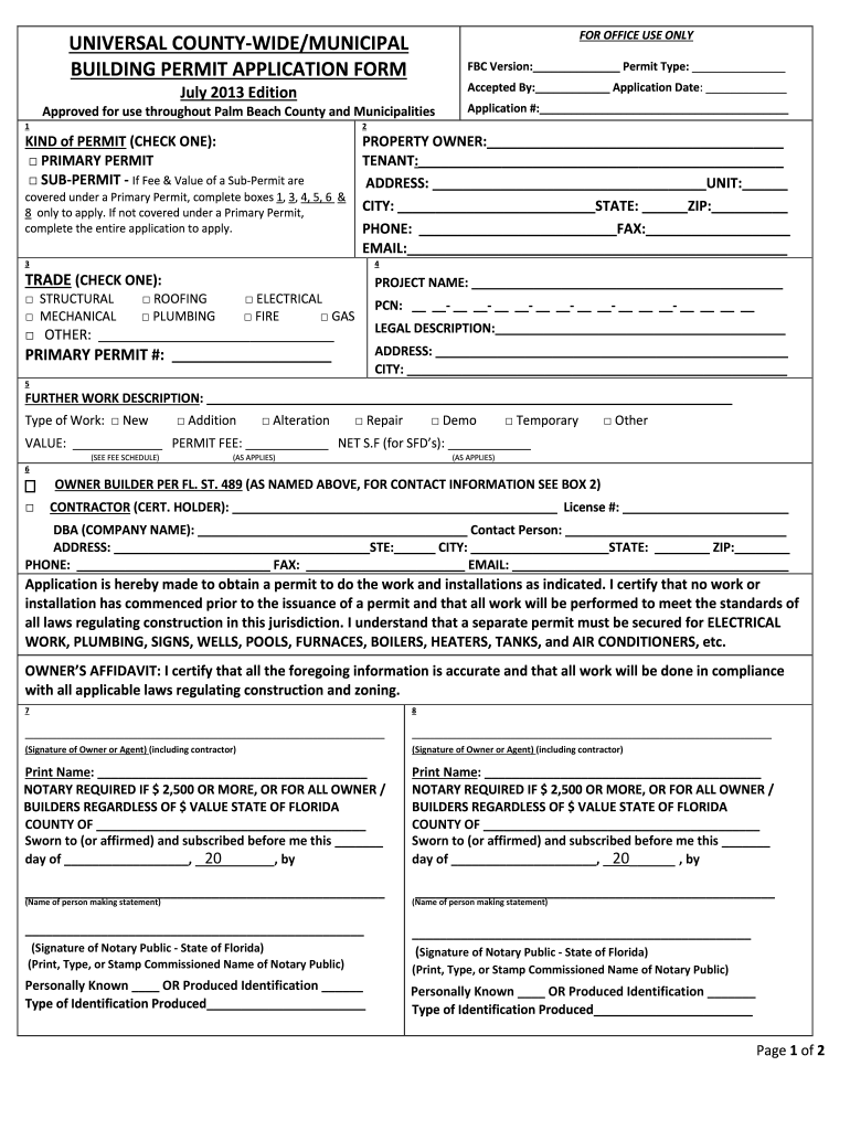 The Building Permit Application Form is a government document used by property owners and contractors to apply for various types of building permits in Palm Beach County and municipalities.