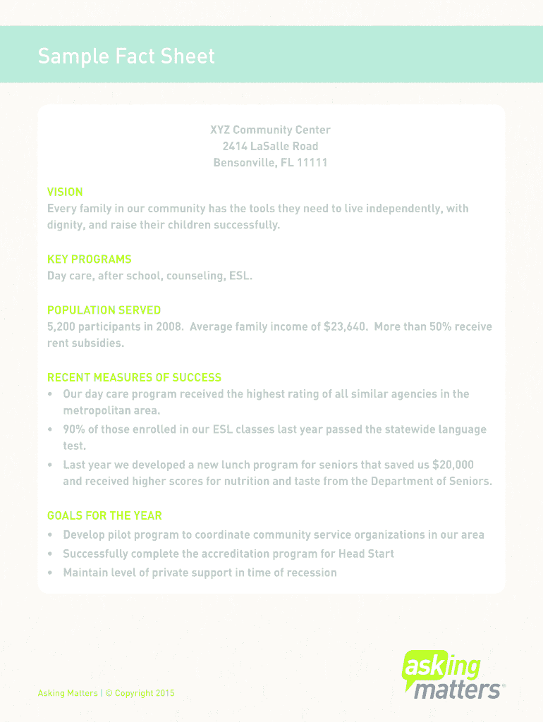 Sample Fact Sheet XYZ Community Center 2414 Basally Road Bentonville, FL 11111 VISION Every family in our community has the tools they need to live independently, with dignity, and raise their children