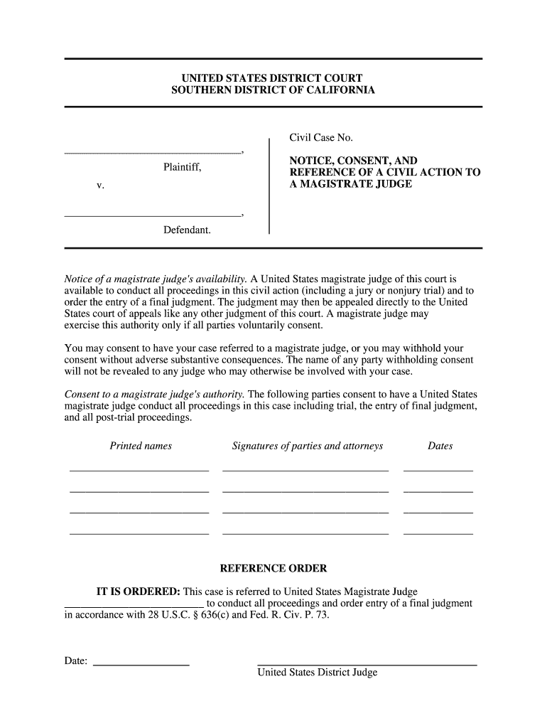 Get the free NOTICE, CONSENT, AND - casd uscourts
