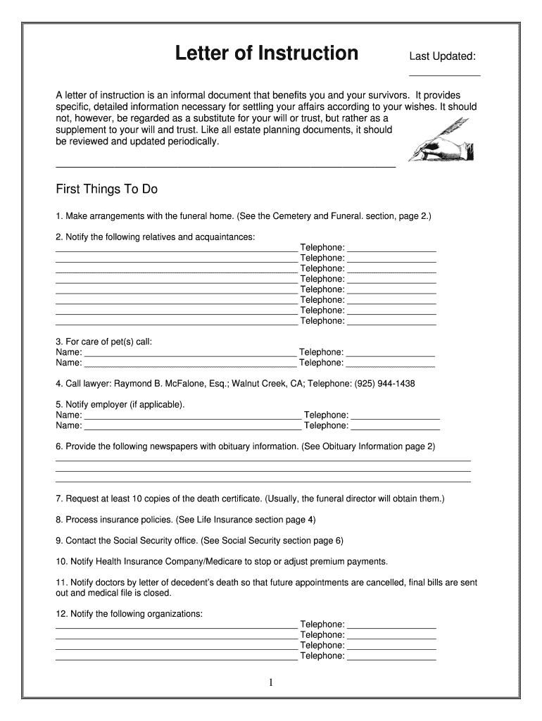 Letter of Instruction Last Updated: A letter of instruction is an informal document that benefits you and your survivors. It provides specific, detailed information necessary for settling your affairs