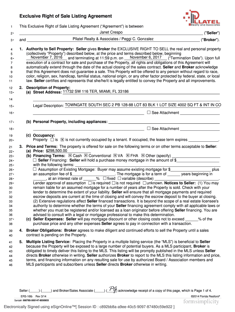 10995347 0 00078550014785509 true 0 FL 1051615 Buyer agrees to pay Plate Realty & Associates a broker transaction fee in the test tbd4 Peggy Gonzalez Ella Exclusive Right of Sale Listing Agreement