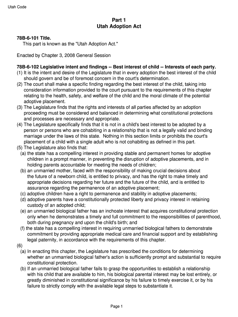 Utah Code Part 1 Utah Adoption Act 78B6101 Title. This part is known as the Utah Adoption Act. “ Enacted by Chapter 3, 2008 General Session 78B6102 Legislative intent and findings Best interest