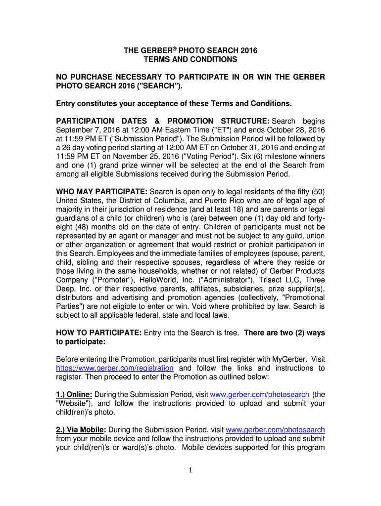 THE GERBER PHOTO SEARCH 2016 TERMS AND CONDITIONS NO PURCHASE NECESSARY TO PARTICIPATE IN OR WIN THE GERBER PHOTO SEARCH 2016 (“SEARCH “). Entry constitutes your acceptance of these Terms and