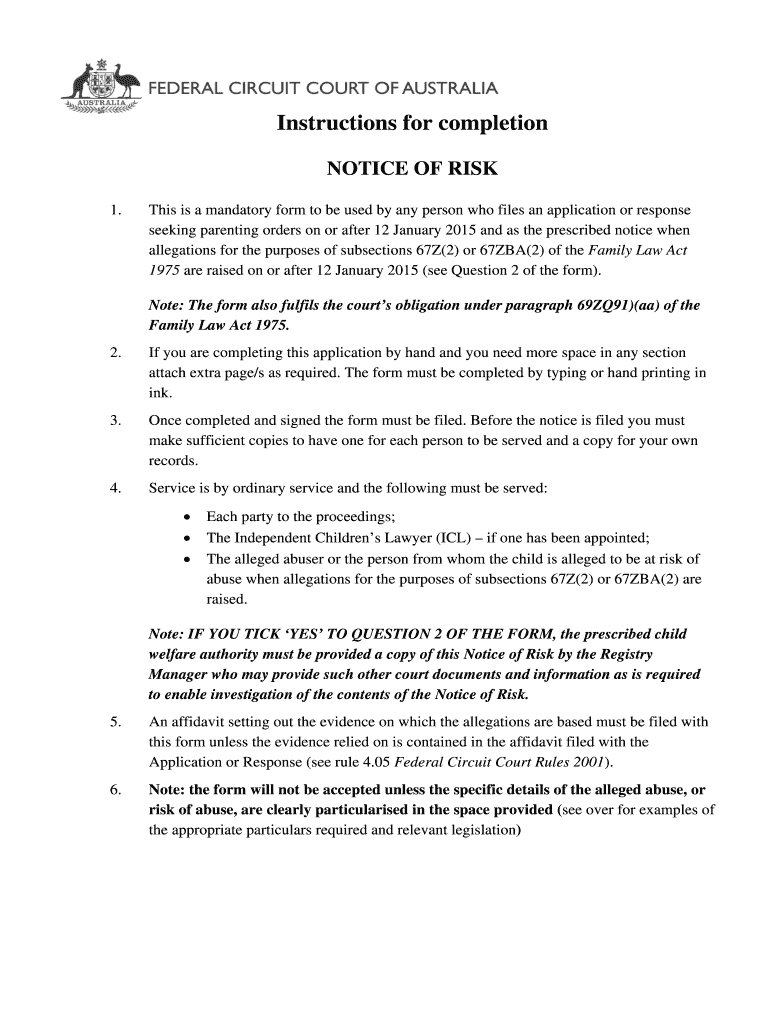 Instructions for completion NOTICE OF RISK 1. This is a mandatory form to be used by any person who files an application or response seeking parenting orders on or after 12 January 2015 and as the