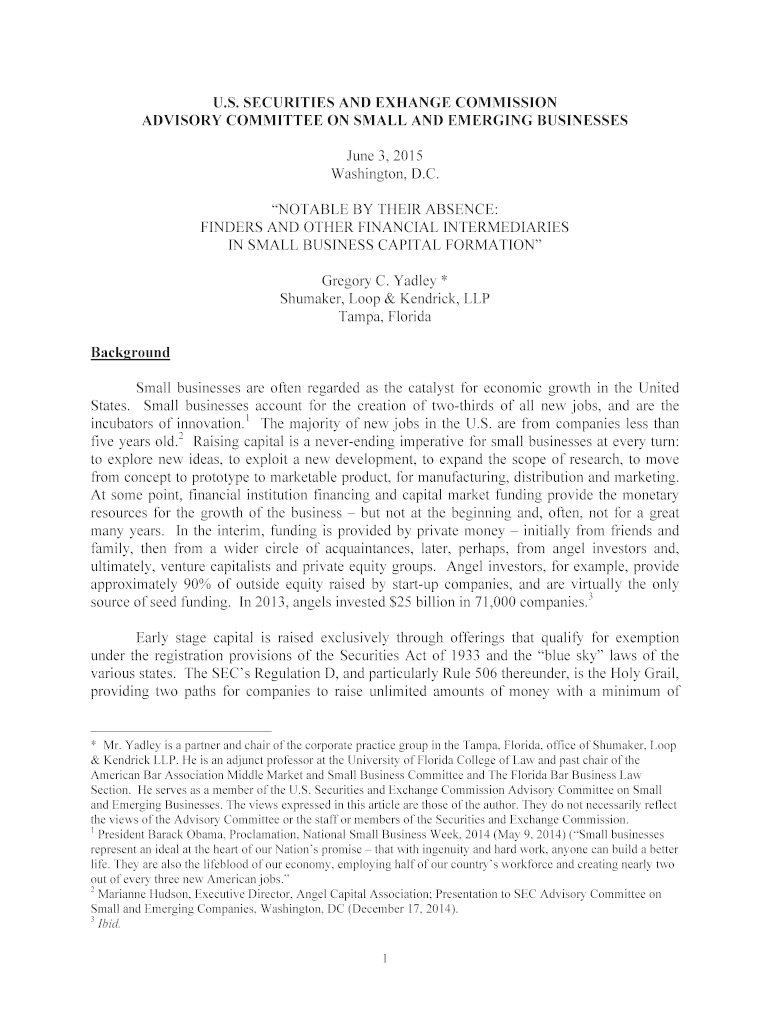 U.S. SECURITIES AND EXCHANGE COMMISSION ADVISORY COMMITTEE ON SMALL AND EMERGING BUSINESSES June 3, 2015, Washington, D.C. NOTABLE BY THEIR ABSENCE: FINDERS AND OTHER FINANCIAL INTERMEDIARIES IN SMALL