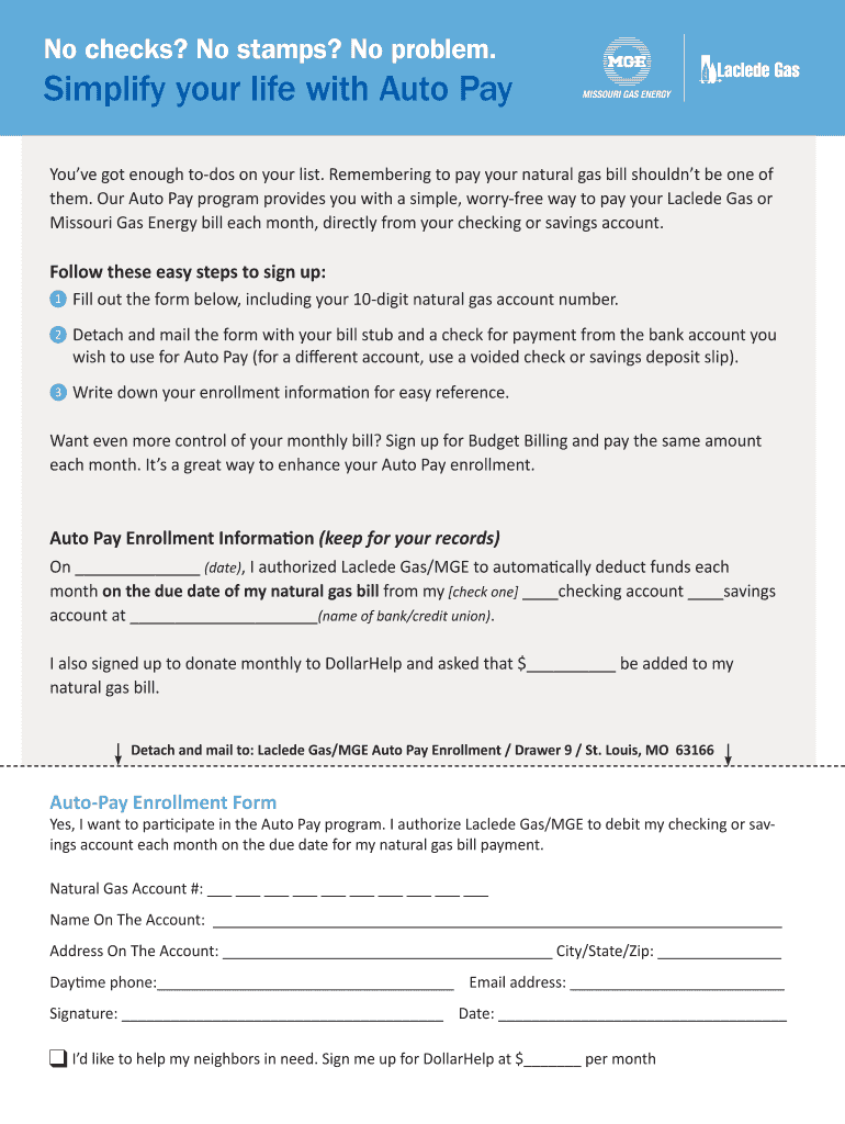 No checks? No stamps? No problem. Simplify your life with Auto Pay You've got enough to-dos on your list. Remembering to pay your natural gas bill shouldn't be one of them. Our Auto Pay program provides