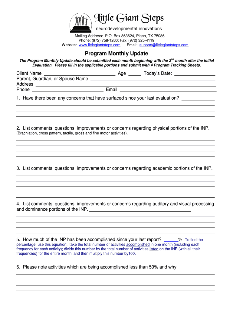 Mailing Address: P.O. Box 863624, Plano, TX 75086 Phone: (972) 7581260; Fax: (972) 3254119 Website: www.littlegiantsteps.com Email: support littlegiantsteps.com Program Monthly Update ND The Program