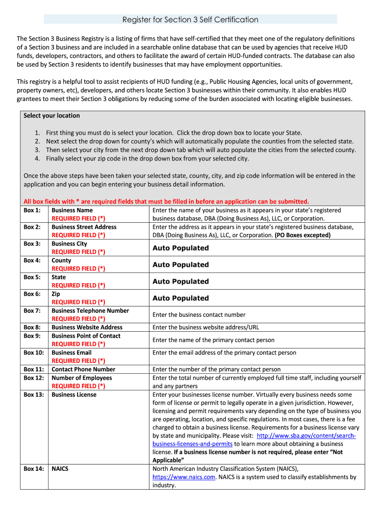 The Section 3 Business Registry is a listing of firms that have self certified that they meet one of the regulatory definitions