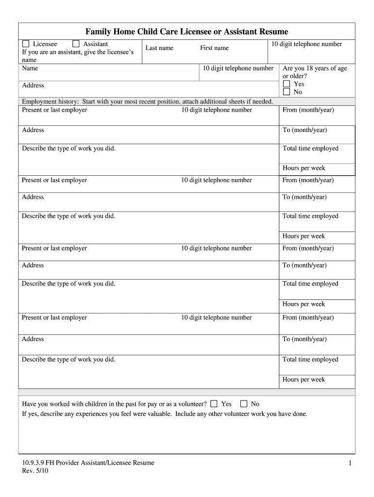 Family Home Child Care Licensee or Assistant Resume Licensee Assistant If you are an assistant, give the licensees name Last name First name 10 digit telephone number 10 digit telephone number Address