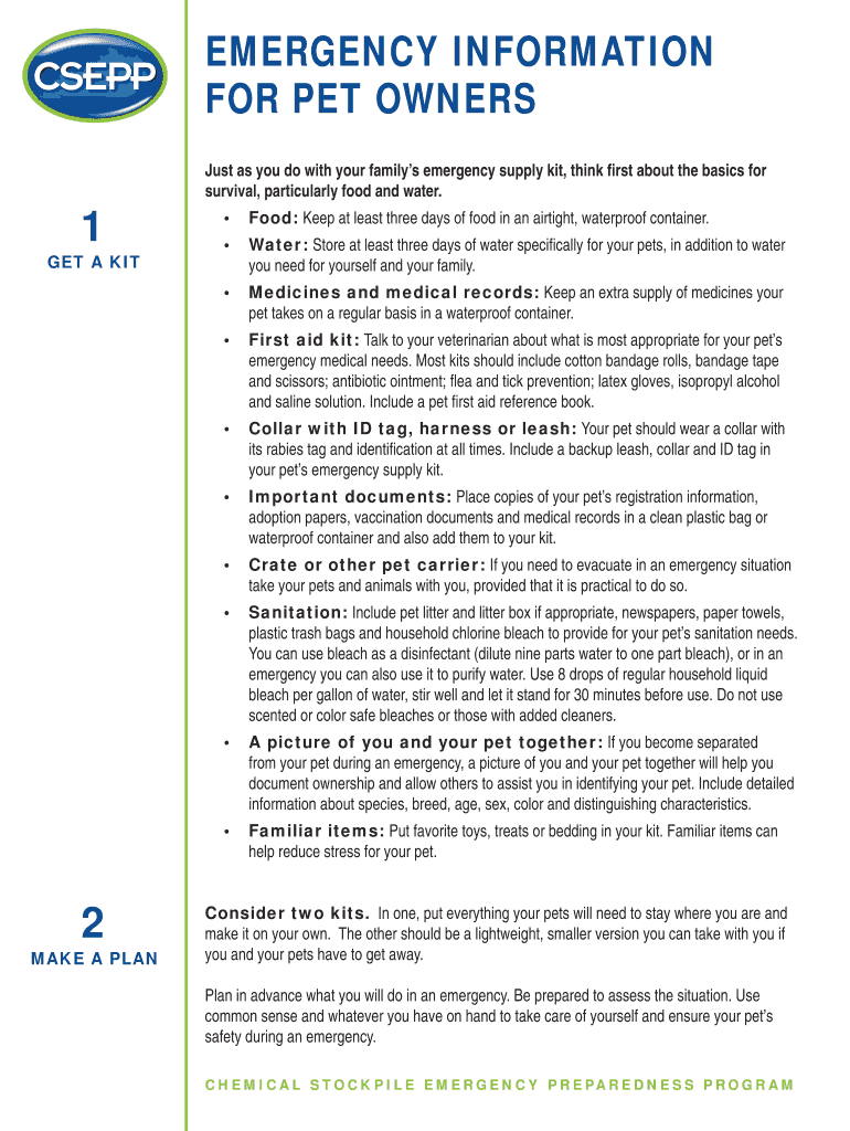 EMERGENCY INFORMATION FOR PET OWNERS 1 GET A KIT Just as you do with your families emergency supply kit, think RST about the basics for survival, particularly food and water. Food: Keep at least three