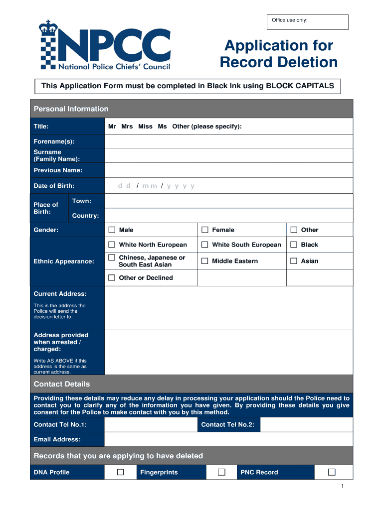Office use only: Application for Record Deletion This Application Form must be completed in Black Ink using BLOCK CAPITALS Personal Information Title: Mr Mrs Miss Ms Other (please specify): Forename(s):