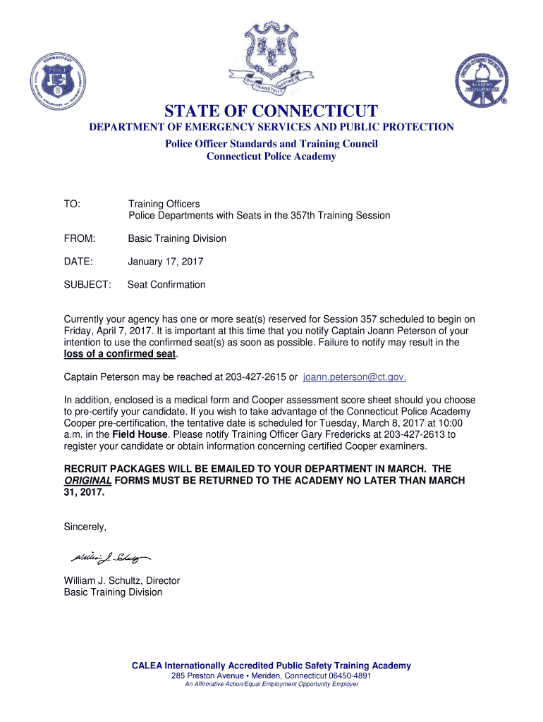 STATE OF CONNECTICUT DEPARTMENT OF EMERGENCY SERVICES AND PUBLIC PROTECTION Police Officer Standards and Training Council Connecticut Police Academy TO: Training Officers Police Departments with Seats